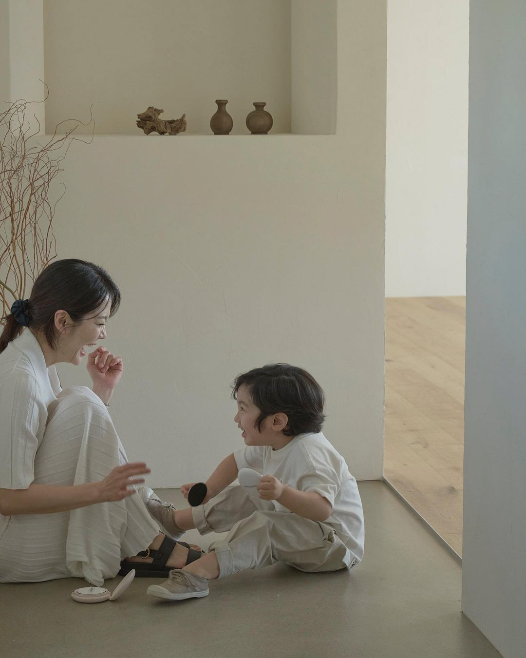 사진 속에는 아들과 시간을 보내고 있는 채림의 모습이 담겨있다. 하얀색으로 옷을 맞춰 입은 모자. 이때 아들의 모든 행동들은 채림을 웃게 했다.