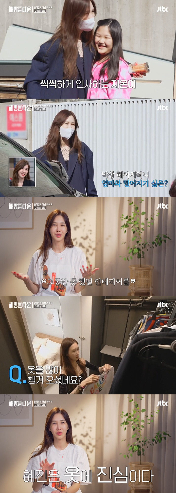 해방타운 입주일, 윤혜진은 "엄마 없이 잘 할 수 있지? 잘 할 수 있지?"라며 가는 순간까지 지온이를 걱정했다. 지온이는 "엄마 같이 가"라면서도 씩씩하게 홀로 집으로 들어갔다. 해방타운에 입주한 윤혜진은 "혼자 있을 때 내 스타일대로 꾸며봐야겠다"고 가족 때문에 못했던 인테리어까지 도전했다.