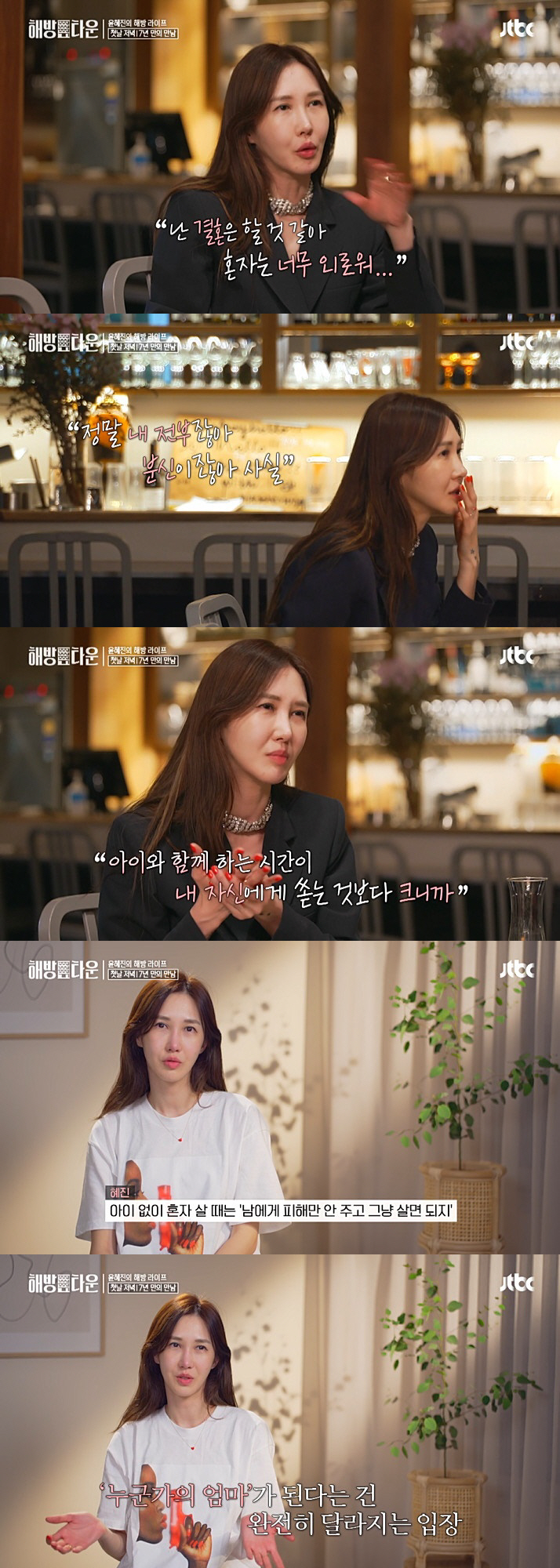 윤혜진은 지온 양을 낳고 산후우울증까지 겪었다고. 그래도 "결혼, 출산을 다시 할 거냐"는 질문에 "결혼은 할 거 같다. 혼자는 너무 싫다. 아이도 너무 좋다. 내 분신이지 않냐. 희생이라 말하긴 그렇지만 아이와 함께하는 시간이 나 자신에게 쏟는 건 맞으니까 신중하게 생각해볼 거 같다"고 밝혔다.