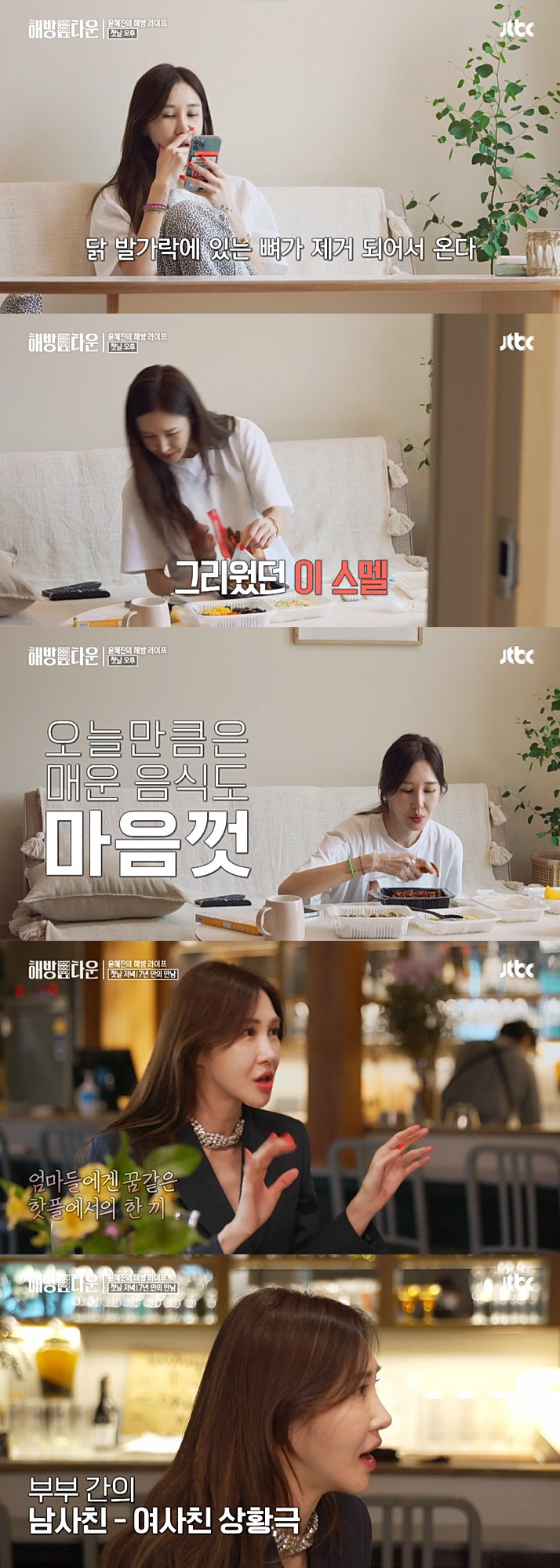 지난 1일 첫 방송된 JTBC 예능프로그램 '해방타운'에서는 집을 떠나 자유를 만끽한 윤혜진의 모습이 담겼다.