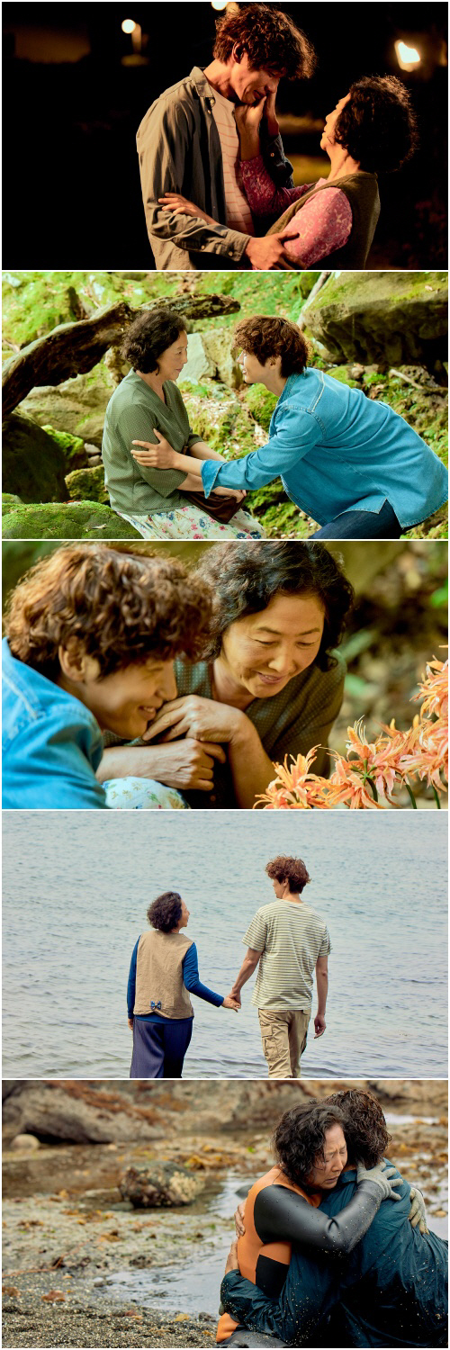 진옥은 해녀 수트를 입고 환하게 미소 짓는 스틸을 통해 물질도, 성질도 최고인 그의 모습을 기대하게 만든다. 진옥은 자신의 다큐멘터리 촬영을 위해 서울에서 내려온 PD 경훈이 성가시지만, 그를 만나면서 잊고 있었던 감정들을 하나 둘 꺼내기 시작한다. 경훈과 함께하며 설레하는 진옥의 표정들은 답답한 고무옷 속에 숨겨져 있던 소녀 같은 모습을 엿보게 만든다. 두 사람은 해녀 작업장에서 해녀들과 하나가 되어 노래를 부르고, 다큐멘터리 촬영을 위해 진옥이 좋아하는 숲을 걷고, 상사화를 보며 미소 짓는 등 점점 가까워지는 모습을 통해 앞으로 이들이 마주할 빛나는 순간들에 대한 궁금증을 자아낸다. 서로의 상처를 공유하고, 위로하며 하나가 되는 진옥과 경훈의 스틸은 아름답고도 애틋한 모습을 담으며 영화 속 그들이 그려낼 사랑의 형태에 대한 기대감을 높여낸다.