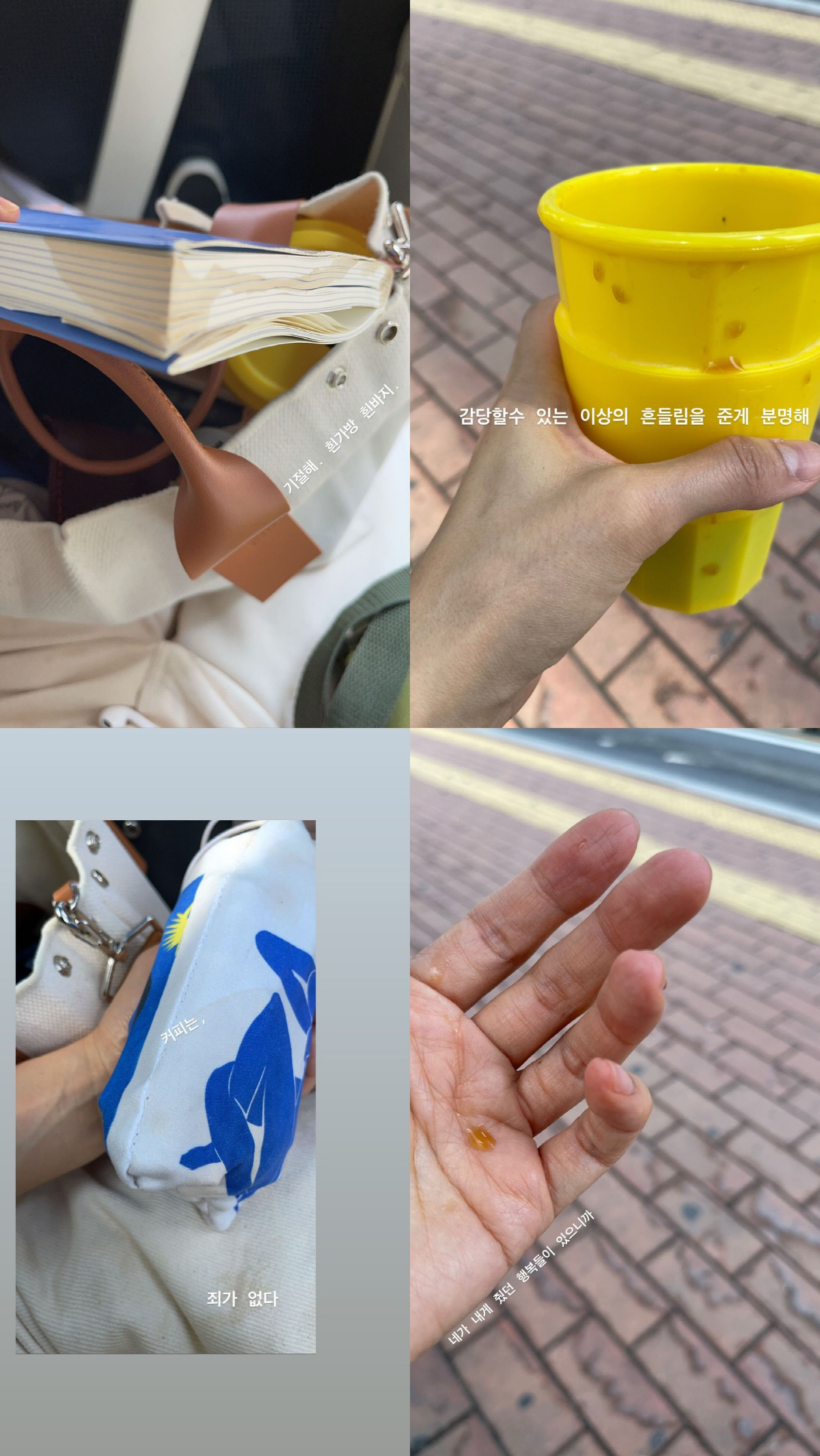 이윤지는 2일 자신의 인스타그램 스토리를 통해 "기절해. 흰 가방 흰 바지"라는 글과 함께 한 장의 사진을 게재했다. 공개된 사진 속에는 책과 가방, 바지에 커피가 새어 나와 묻은 모습. 이윤지는 텀블러 안에 커피를 꽁꽁 쌌지만 결국 새어 나와 소지품을 다 적시고 말았다. 이윤지는 "커피는 죄가 없다", "감당할 수 잇는 이상의 흔들림을 준 게 분명해"라면서도 "스며드는 일에 대한 명상…을 할 수가 없다"고 한숨을 내쉬었다.