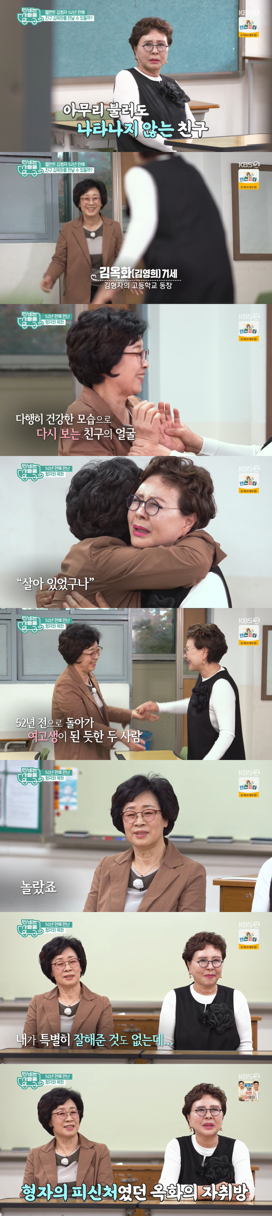 친구는 "찾아줘서 고맙다"고 말했고, 김형자는 "살아있었구나"라면서 52년 전으로 돌아가 여교생이 된 듯 미소를 지었다.