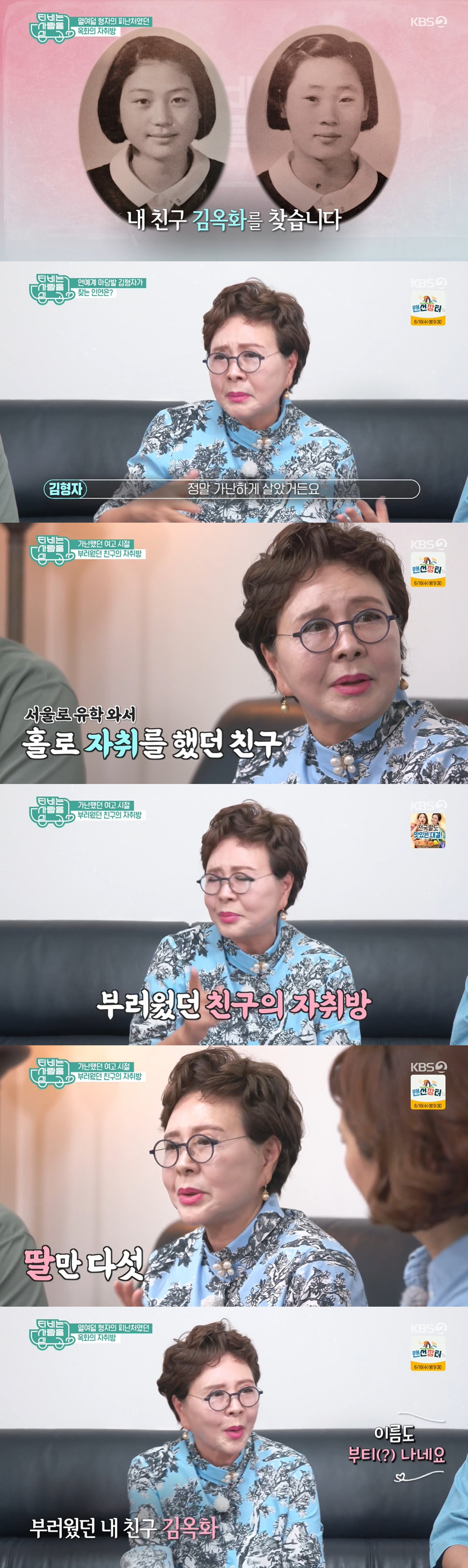 김형자는 "당시 집집마다 가난하게 살았다. 가족 모두 단칸방에서 살았던 시절이다"면서 "그 친구는 지방에서 서울로 유학을 와서 자취를 했다. 부럽더라. 내 방 갖는 게 꿈이었다"고 떠올렸다.