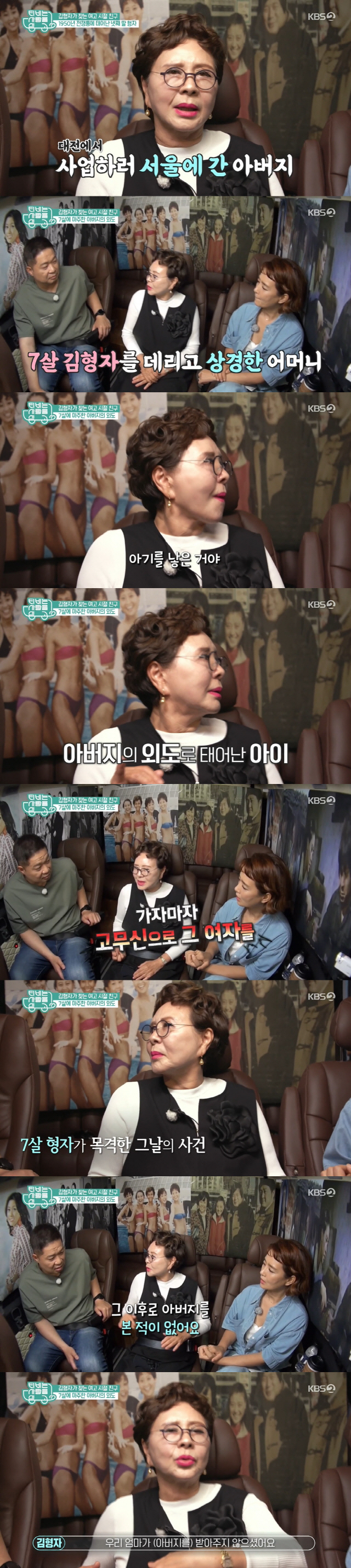 김형자는 "우리 어머니가 받아주지 않았다. 못 오게 했다"면서 "그때는 이혼이라는 게 없었다"며 아버지의 외도 후 어머니가 가장이 됐다고.