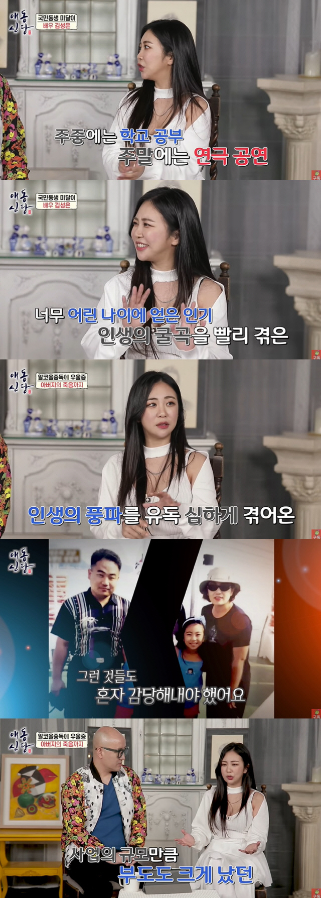 결국 어린 나이에 뉴질랜드로 유학을 떠난 김성은. 뉴질랜드 유학 생활은 편안했지만 사업 실패로 부도가 나면서 급하게 한국으로 돌아왔다고. 김성은은 "짐도 못 챙기고 도망을 갔다. 사춘기도 왔는데 부모님 불화는 여전했다"며 이후 아버지가 갑자기 세상을 떠났다고 밝혔다. 아버지가 세상을 떠난 후 "정신줄을 놨다"는 김성은은 폭음, 우울증, 알코올중독 증상 등을 겪었다고.