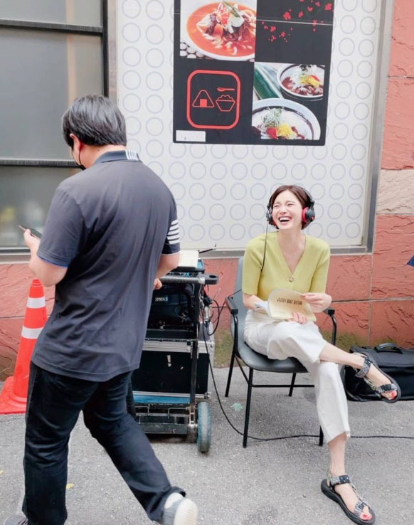 사진 속에는 주말, 촬영을 위해 준비 중인 정가은의 모습이 담겨있다. 헤드폰을 낀 채 의자에 앉아 촬영을 위한 준비를 하며 휴식을 취하고 있다. 양손에는 대본을 꼭 쥐고 있는 모습. 이때 폭소를 터트리고 있는 정가은의 모습이 눈길을 끈다.