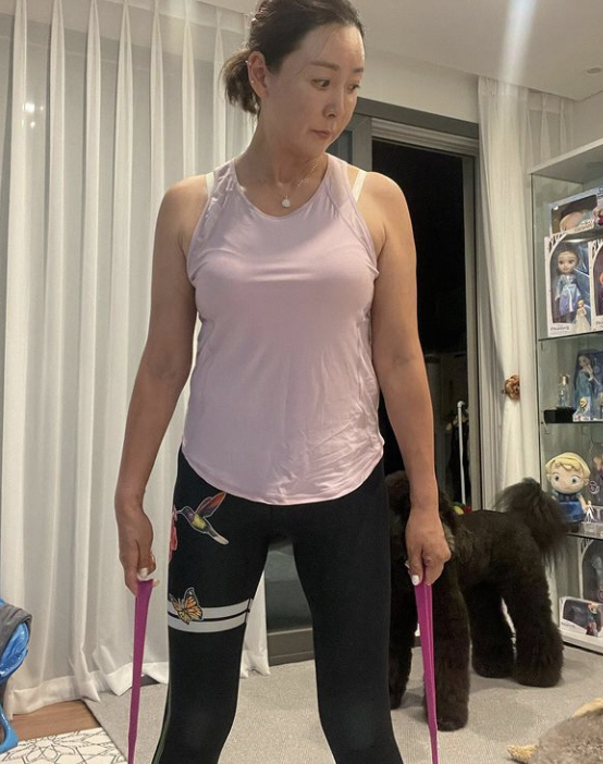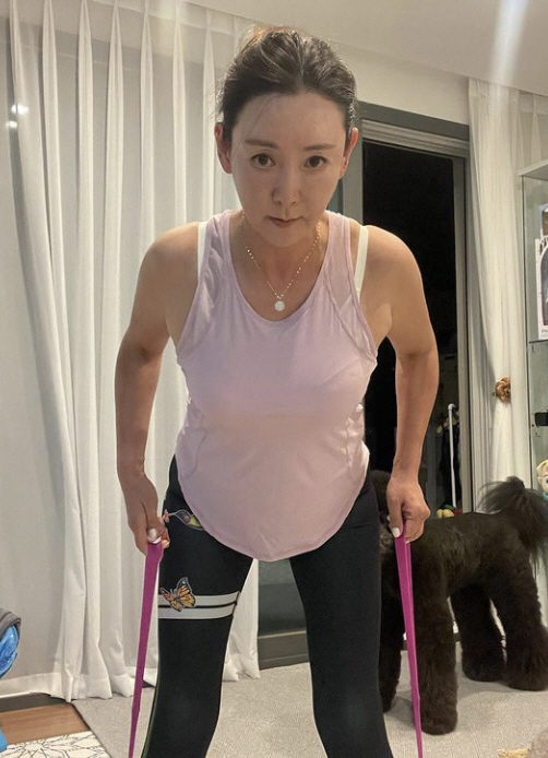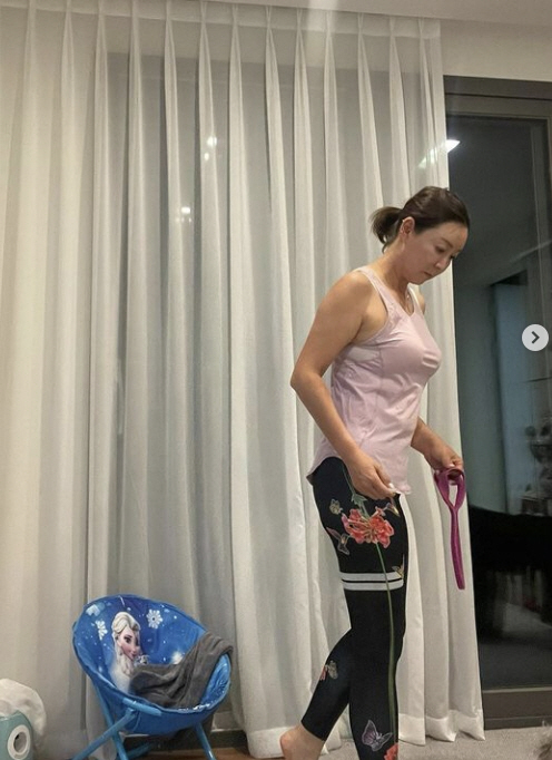 이상아는 밴딩 운동에 집중하는 모습으로 다이어트에 돌입한 모습을 선보였다.