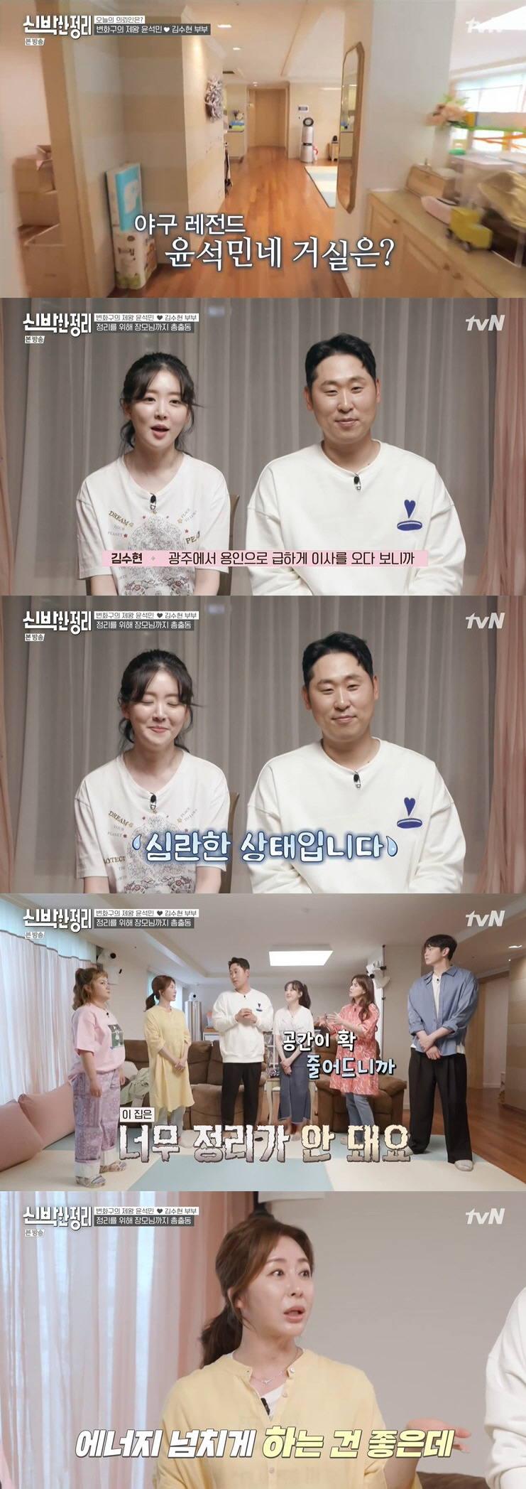 윤석민은 "아내가 육아, 살림, 내조까지 다 해야 하지 않냐. 근데 제가 은퇴한 후 조그맣게 사업까지 한다. 원래 엄청 깔끔한 성격인데 정리를 할 수가 없다"고 아내 김수현의 고충을 밝혔다.