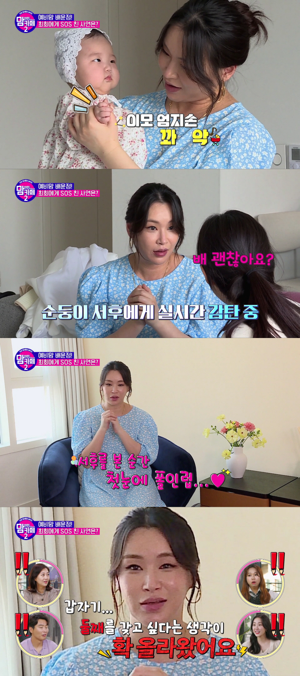 '맘카페' 멤버들이 벌써부터 둘째를 생각하는 모습에 당황하자, 배윤정은 "딸이 갖고 싶다는 얘기"라고 웃으며 "모유를 먹일 때 아기가 나를 쳐다보면 너무 사랑스러워서 정말 눈물 날 것 같다"고 했다.