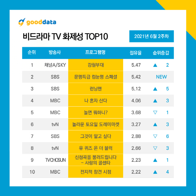 [스포츠조선 이승미 기자]채널A/SKY '강철부대'가 6월 2주차 비드라마 화제성 1위는 차지했다.
