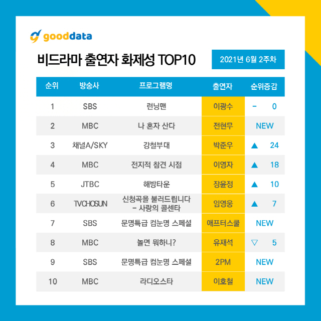이 밖에 JTBC '해방타운'에서 꾸준한 호평을 얻고 있는 장윤정이 비드라마 출연자 화제성 5위에, MBC '라디오스타' 게스트로 출연한 배우 이호철이 비드라마 출연자 10위에 진입했다.