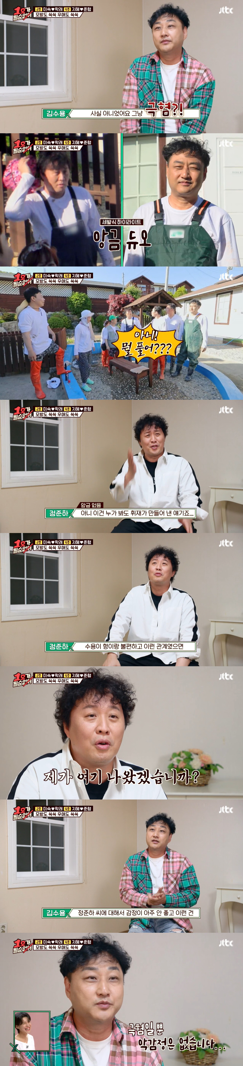 이에 정준하는 "누가 봐도 휘재가 만들어낸 이야기다"며 "수용이 형이랑 불편한 관계였으면 여기 어떻게 나왔겠나. 안 나온다"고 했다. 김수용은 "정준하 씨에 대해서 감정이 아주 안 좋고 이런 건 사실 아니다. 그냥 극혐?"이라고 해 웃음을 자아냈다.