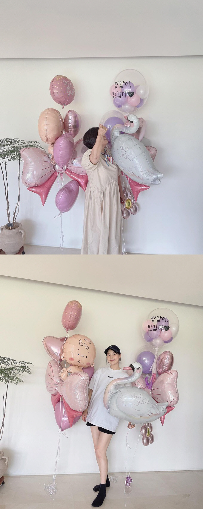 공개된 사진 속 한지혜와 어머니는 '방갑이(태명) 반갑다♥'라는 메시지가 적힌 축하 풍선을 들고 포즈를 취하고 있다. 짧은 하의를 입은 한지혜는 출산을 앞둔 만삭 임신부임에도 늘씬한 각선미를 과시해 눈길을 끈다.