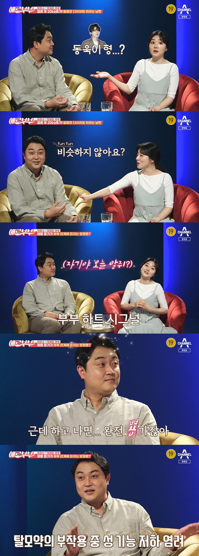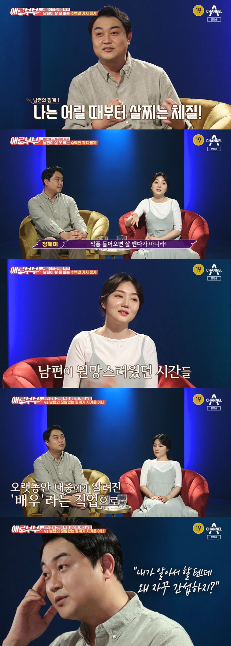 '속터뷰'를 신청한 정혜미는 고민에 대해 "결혼하고 20kg 정도 쪘는데 말만 하고 살을 안 뺀다. 관리를 안 하고 제가 무슨 말만 하면 '네가 해줘'라고 한다. 게을러지고 관리도 안하고 살도 쪘다"고 여현수의 살을 언급했다.