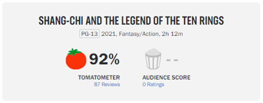 영화 '샹치와 텐 링즈의 전설'이 해외 첫 시사와 동시에 전 세계 유수 언론과 평단의 극찬 세례를 받고 있다. 이와 함께 영화비평사이트 로튼 토마토에서 신선도 지수 92%를 기록해 눈길을 사로잡는다. 외신들은 "마블이 제대로 해냈다"(Daily Telegraph (UK)), "마블이 만든 최고의 영화 중 하나"(Timeout)라며 마블 스튜디오가 선보이는 또 하나의 역작으로 손꼽은 데 이어 "아이언맨, 토르, 캡틴 아메리카, 블랙 팬서 같은 훌륭한 솔로 무비"(Your Money Geek), "멋지고 새로운 MCU 캐릭터의 매력적인 데뷔작" (Timeout), "새로운 마블 히어로의 앞날을 기대하게 만드는 첫 출발"(Screen Rant), "마블 역대 최고 솔로 무비 중 하나"(Flickering Myth) 등 마블 페이즈 4를 이끌어갈 새로운 슈퍼 히어로 '샹치'의 성공적인 데뷔를 알린 작품이라며 극찬을 아끼지 않았다. 또한 "액션으로 가득한 엔터테이닝 무비"(The Guardian), "MCU 사상 최고의 액션씬"(Nerd Reactor), "정형화된 할리우드 공식을 뒤집는 짜릿한 액션 판타지"(Forbes), "타격감 넘치는 역동적인 액션"(Slashfilm) 등 '샹치와 텐 링즈의 전설'에서만 볼 수 있는 액션에 대한 찬사가 계속되면서 마블 사상 본 적 없는 새로운 스타일의 익스트림 액션에 대한 기대감을 고조시킨다. 여기에 "시무 리우와 아콰피나의 완벽한 연기 호흡"(Ask), "양조위는 단순히 스타가 아니다. 그의 연기는 액션을 끌어올리고 모든 프레임에 스며든다"(The Atlantic), "유머와 감정의 밸런스가 놀라울 정도로 탄탄하다. 액션은 더 놀랍다"(Flick Fan Nation)등 배우들의 뛰어난 연기력과 깊이, 캐릭터들 간의 유쾌한 케미까지 최고의 평이 이어져 개봉을 기다리는 예비 관객들의 기대감을 높인다.