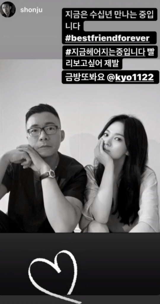 주형선 헤어스타일리스트는 사진과 함께 "지금 수십 년 만나는 중입니다. best friend forever. 지금 헤어지는 중입니다 빨리 보고 싶어. 제발. 금방 또 봐요"라고 글을 남기며 송혜교와의 친분을 드러냈다.
