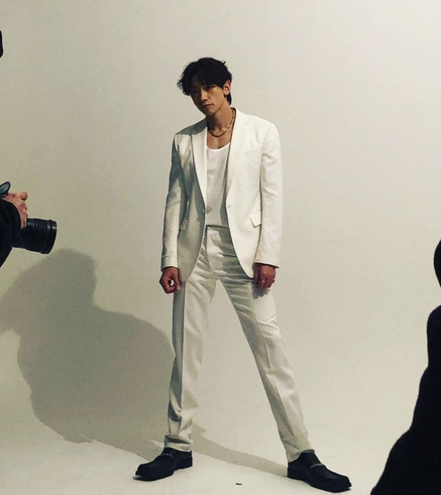 비는 올화이트 수트를 입고 8등신 비율과 탄탄한 몸매로 감탄을 자아냈다.