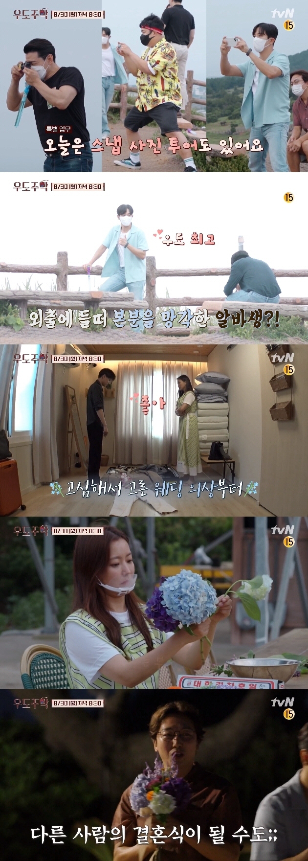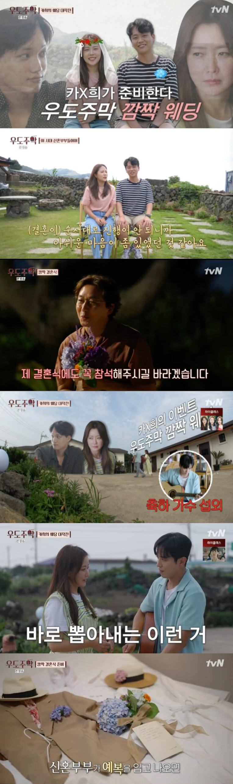 이벤트의 시간이 다가오고 카이는 "범수씨와 예진씨가 아직 결혼식을 올리지 못하지 않았냐. 그래서 저희가 소소하게 준비한게 있다"고 말했다. 얼떨떨한 표정으로 자리에서 일어난 긴범수씨와 김예진씨. 우도주막 식구들의 안내에 따라 방에 들어가니 이벤트 의상이 놓여있었다.