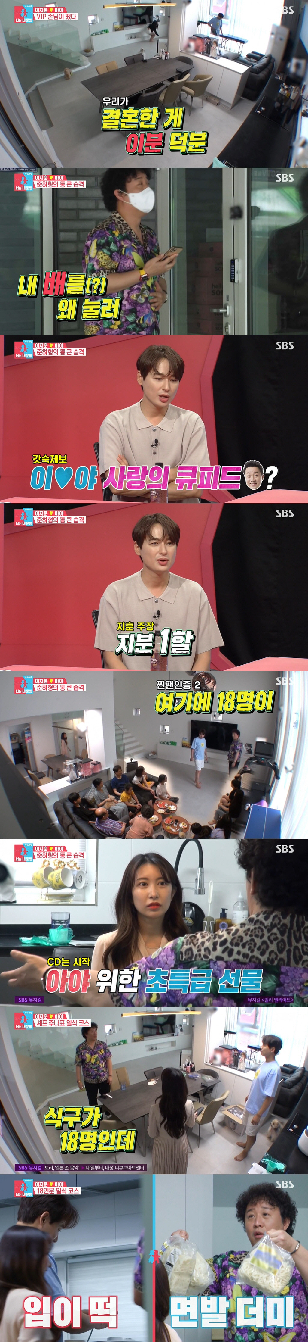 이지훈은 "준하 형이 '너와 아내의 연결고리 지분 8할을 갖고 있다'고 하는데, 1할 정도다"면서 "뮤지컬 갈라쇼에서 준하 형 지인이 일본분이 계셨는데 그 분이 아내를 공연을 데려왔다. 뒷풀이 자리에서 합석했다"고 떠올렸다.