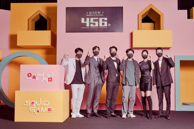 15일 넷플릭스는 새 오리지널 시리즈 '오징어게임'(황동혁 극본, 황동혁 연출)의 제작발표회를 신종 코로나바이러스 감염증(코로나19) 확산 방지를 위한 온라인 생중계로 진행했다. 행사에는 이정재, 박해수, 위하준, 정호연, 허성태, 황동혁 감독이 참석했다.