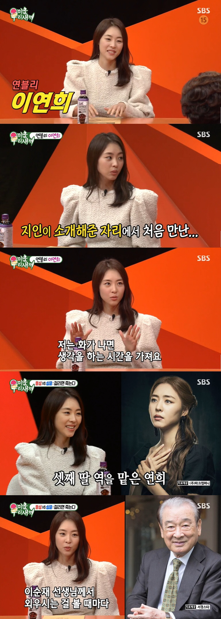 결혼을 결심한 계기, 남편이 운명의 짝이라고 느낀 계기는 첫 만남에서부터였다. 이연희는 "처음 만났을 때였던 거 같다"며 "주선자 분이 계셨다. 소개팅을 한 번도 한 적이 없었는데 편하게 같이 밥 한 번 먹자더라. 편한 차림으로 나갔다"고 남편을 처음 만난 계기를 밝혔다. 이에 서장훈은 "생애 첫 소개팅에서 만난 남자와 결혼하게 된 거냐"며 놀랐다.