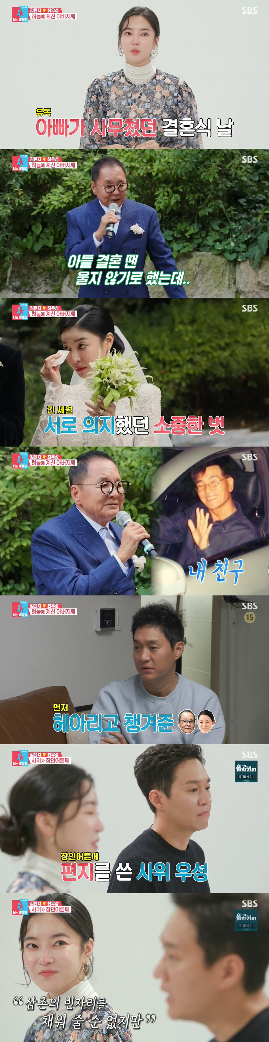 이날 김윤지는 "오빠랑 결혼하기까지 가장 기억에 남는 것 중에 하나가 오빠가 아빠한테 장문의 편지를 쓴 거다. 내용을 못 읽게 해서 아직도 정확히 어떤 내용을 썼는지는 모른다"고 말했다. 최우성은 "장인어른한테 나의 진심을 보여주기 위해 쓰는 글씨체에 연연했다. 한 자도 틀리지 않게 예쁘게 써서 드려야겠다고 생각해서 시간이 오래 걸렸다. 작문하는 데도 오래 걸렸다"며 "편지에는 삼촌이라고 썼다. 삼촌의 빈자리를 채워줄 수는 없겠지만, 윤지와 어머니, 동생한테 잠깐 쉬어갈 수 있는 그늘이나 나무 정도는 되어드리겠다고 했다"고 전해 감동을 자아냈다. 최우성의 편지를 아빠 모신 곳에 보관했다는 김윤지는 "오빠가 엄마한테만 편지를 공개했는데 엄마가 안심하는 느낌이었다"고 전했다.
