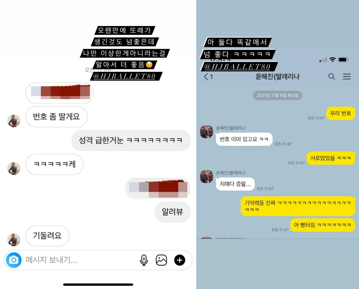 배윤정은 9일 자신의 SNS를 통해 "오랜만에 또래가 생긴 것도 너무 좋은데 나만 이상한 게 아니라는 걸 알아서 더 좋음"이라는 글과 함께 한 장의 사진을 게재했다. 공개된 사진 속에는 윤혜진과 배윤정의 DM이 담겼다. MBC 예능프로그램 '라디오스타' 게스트로 함께 출연해 인연을 맺은 듯한 두 사람. 윤혜진은 자신의 번호를 보내며 "번호 좀 딸게요"라고 적극적으로 나섰고 배윤정도 자신의 번호를 알려주며 "알러뷰"라고 화답했다. 그러나 이미 두 사람은 서로의 번호를 딴 적이 있는 사이였다. 배윤정과 윤혜진은 "우리 번호 서로 땄었다"고 놀라며 "치매다 정말…"이라고 한탄해 웃음을 안겼다. 안무가와 발레리나 친구의 유쾌한 케미가 돋보인다.