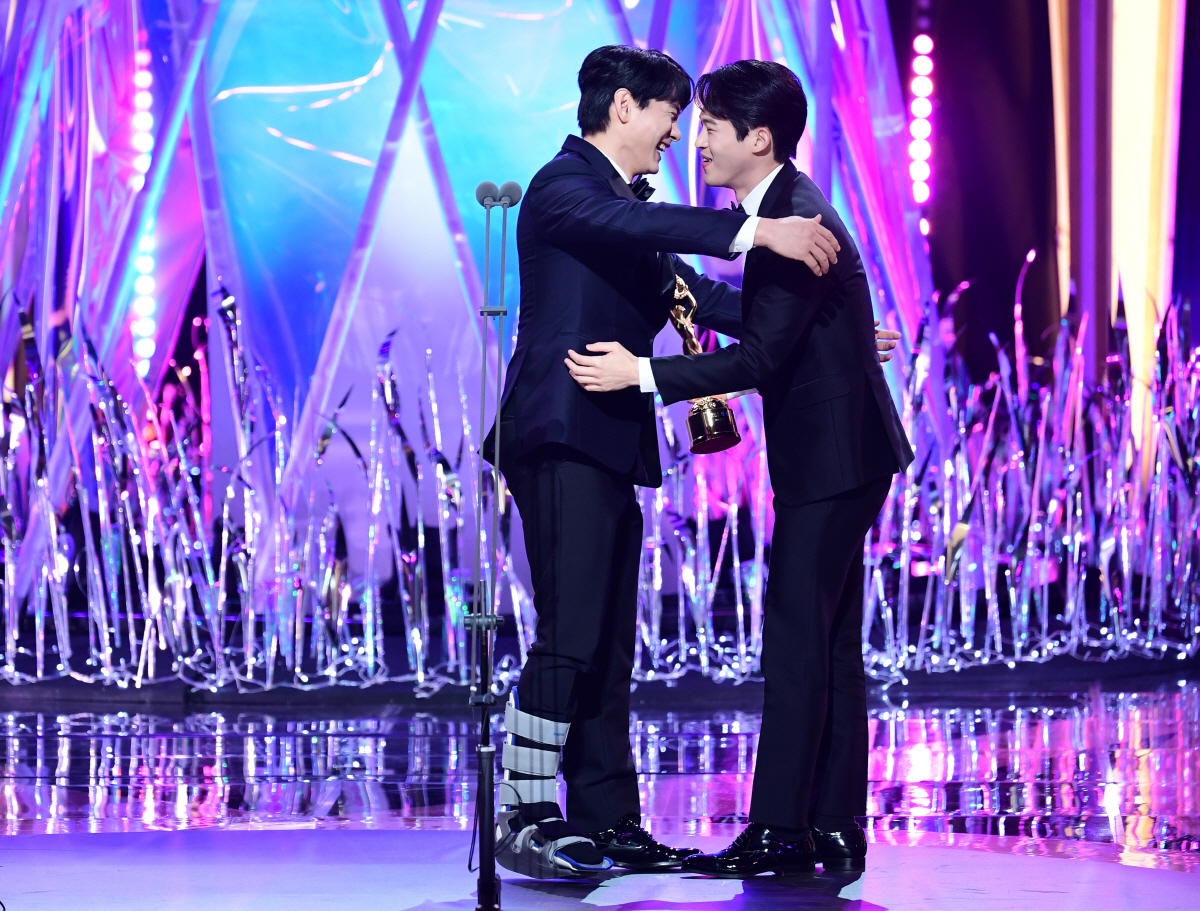 제42회 청룡영화상 시상식이 26일 서울 여의도 KBS홀에서 열렸다. 신인남우상을 수상한 '낫아웃'의 정재광이 시상을 한 유태오와 포옹을 하고 있다. 여의도=송정헌 기자 songs@sportschosun.com/2021.11.26/