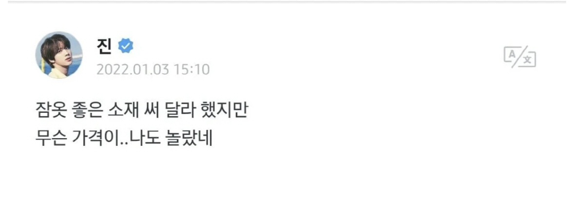 이같은 반응을 접했는지, 진은 위버스에 "잠옷 좋은 소재 써달라 했지만 무슨 가격이…나도 놀랐네"라는 글을 올려 눈길을 끌었다.