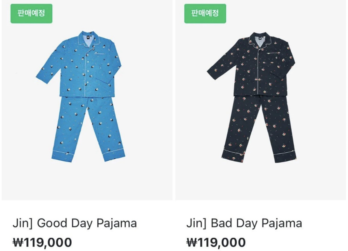 진은 '내 기준에 맞춰서 뿌듯하게 살았다 이럴 때는 천사 (무늬가 들어간) 잠옷을 입고 베개를 하고, 내가 열심히 살고 싶은데 그 기준에 못미쳤다 싶을 때는 악마 잠옷을 입는다'고 소개했다. 진은 "80% 정도 아이디어를 냈다. 제가 잠옷을 입을 때 주머니가 없어서 불편했다. 이런 점을 개선해 주머니에 충분히 핸드폰도 넣을 수 있게 노력했다"며 이 제품에 큰 애정을 표현했다.