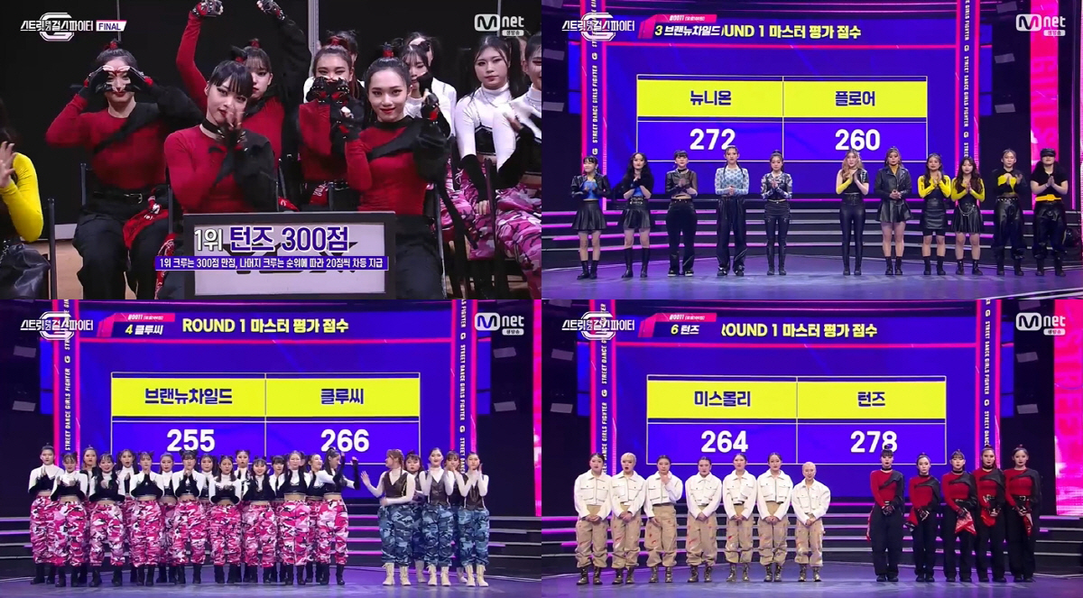 뉴니온과 플로어는 ITZY의 'Weapon'으로, 클루씨와 브랜뉴차일드는 전소연의 'Fire'에 맞춰 합동 퍼포먼스를 펼쳤다. 이어 미스몰리와 턴즈는 마마무 솔라&문별의 'Bada Boom'으로 강렬한 합동 퍼포먼스를 선사했다. 1라운드에서 가장 높은 점수를 획득한 크루는 턴즈였다. 턴즈는 마스터 현장 평가의 평균 점수에서 278점을 받았다. 또한 턴즈는 사전 챌린지 미션에서도 1위를 차지해 300점을 획득했다.