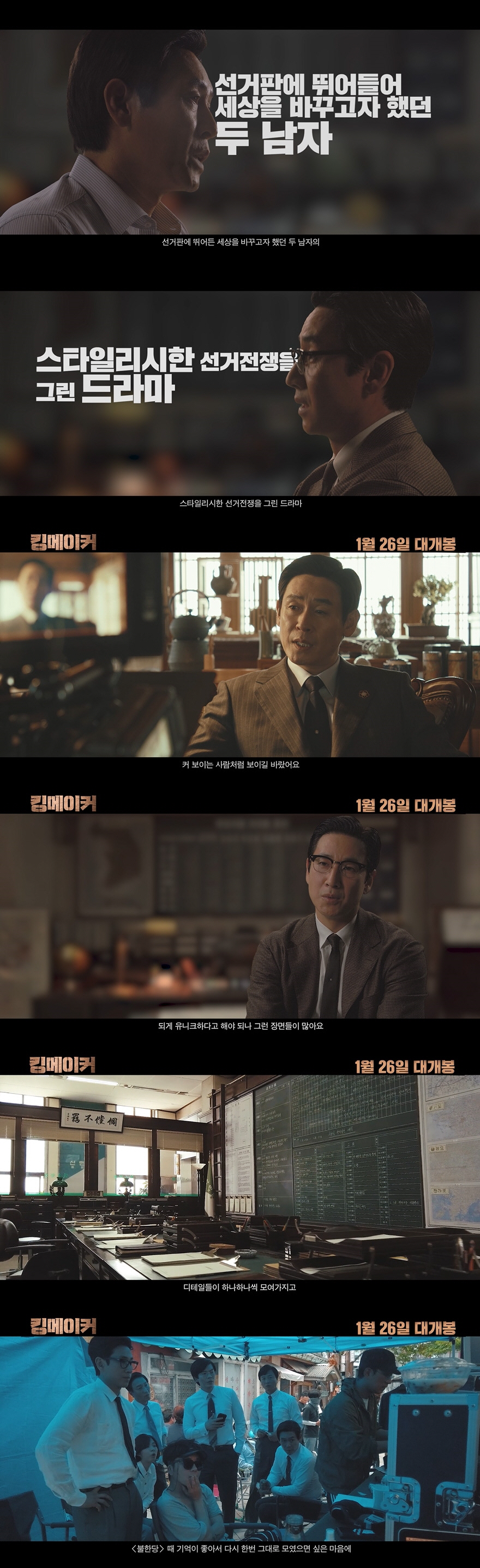 '킹메이커'는 세상을 바꾸기 위해 도전하는 네 번 낙선한 정치인과 존재도 이름도 숨겨진 선거 전략가가 치열한 선거판에 뛰어들며 시작되는 이야기를 그린 작품이다. 설경구, 이선균, 유재명, 조우진, 박인환, 이해영, 김성오, 전배수, 서은수, 김종수, 윤경호, 그리고 배종옥이 출연했고 '나의 PS 파트너' '불한당: 나쁜놈들의 세상'의 변성현 감독이 메가폰을 잡았다. 설 연휴를 앞둔 오는 26일 개봉한다.