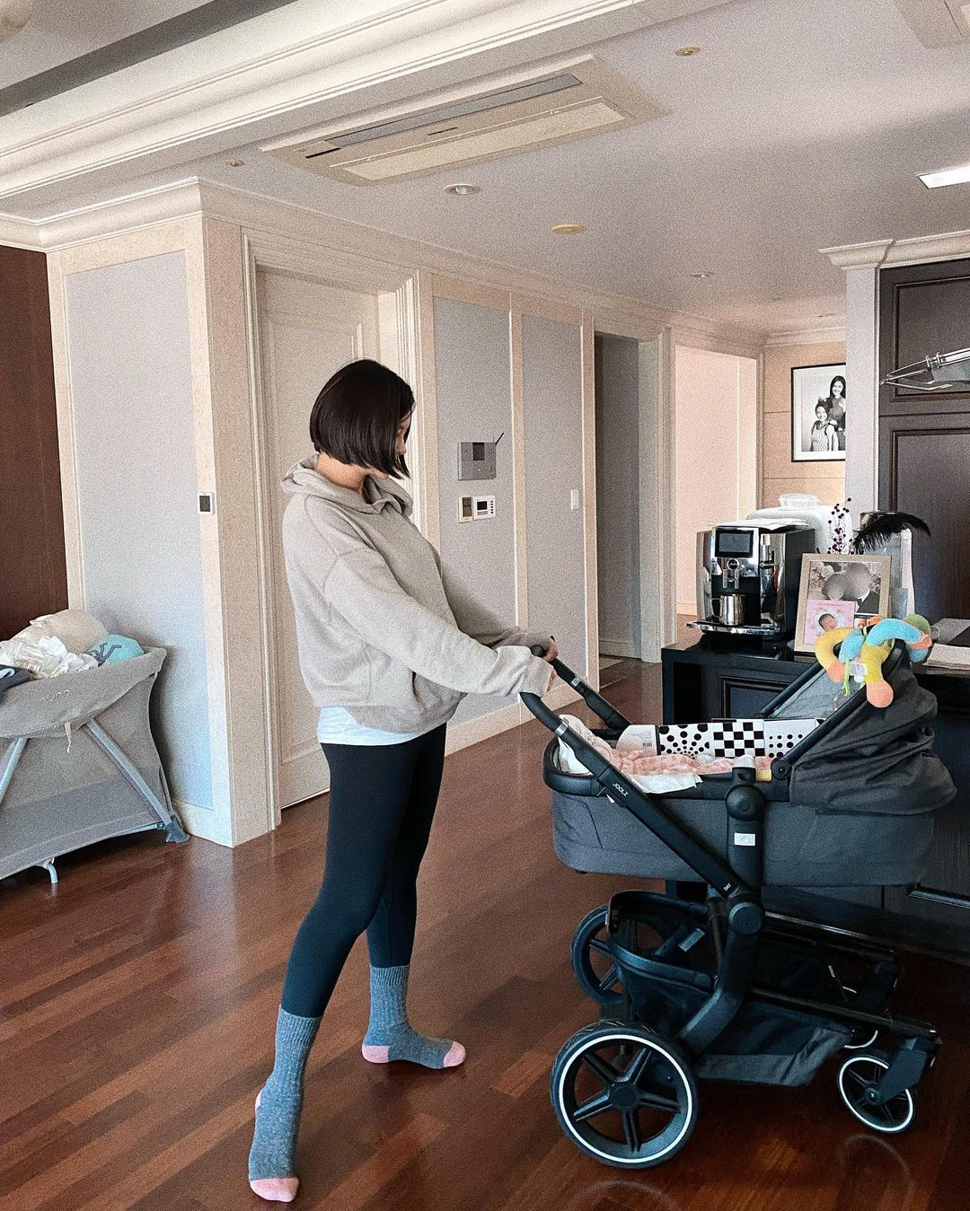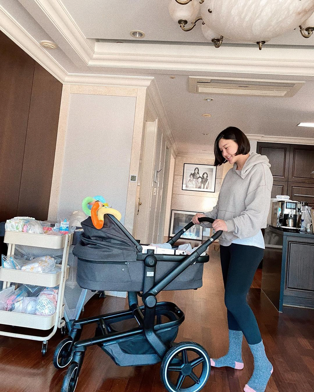 공개된 사진 속에는 유모차를 끌고 있는 박은지의 모습이 담겼다. 후드티에 레깅스를 입고 딸을 보고 있는 박은지는 미소를 감추지 못하는 모습. 하루하루 커가는 딸을 보며 행복해하는 박은지의 달라진 일상이 엿보인다. 특히 출산 후 18kg 감량에 성공했다는 박은지는 쭉 뻗은 레깅스핏을 자랑한다.