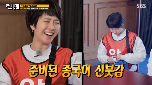 다수가 모이는 방이 승리하는 마지막 미션에서도 양세찬이 팀이 승리해 막내를 결정하는 투표권을 다수 획득했다. 결국 멤버들과 스태프가 참여한 '막내 투표'에서 전소민이 압도적인 차이로 '공식 막내'로 확정됐다. '막내' 전소민은 송지효를 벌칙 수행자로 지목해 함께 '낚시용 예고 소스'를 촬영하는 벌칙을 수행했다. tokkig@sportschosun.com