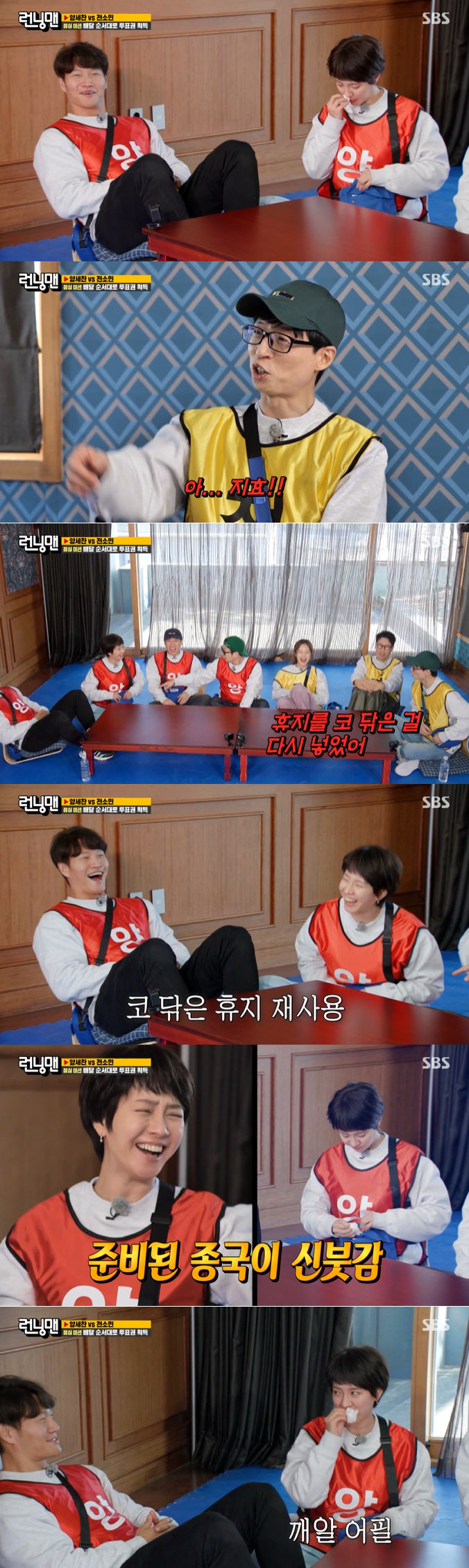 송지효는 폭소를 터트렸다. 그러면서 김종국 앞에서 다시 코 닦은 휴지를 재사용하는 모습을 보이며 자신은 깨알 어필해 웃음을 유발했다. 김종국도 "잘했다"며 송지효의 절약정신을 칭찬해 눈길을 끌었다.