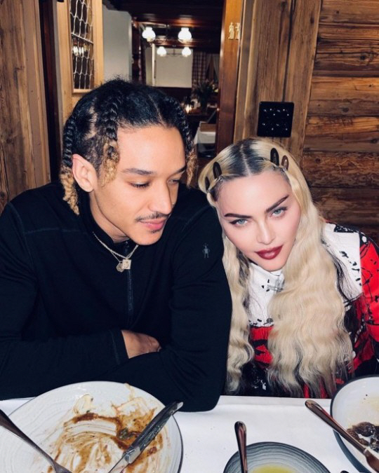 사진 속 마돈나는 스위스의 작은 마을 크슈타트에서 지인들과 즐거운 시간을 보내고 있다. 그는 알라말릭 윌리엄스(27)에 어깨에 기대거나 입맞춤을 하며 이 순간을 즐겼다.