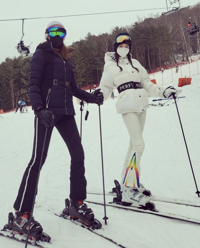 사진에는 지인과 함께 겨울 스포츠인 스키를 타러 나선 한혜진의 모습이 담겼다.