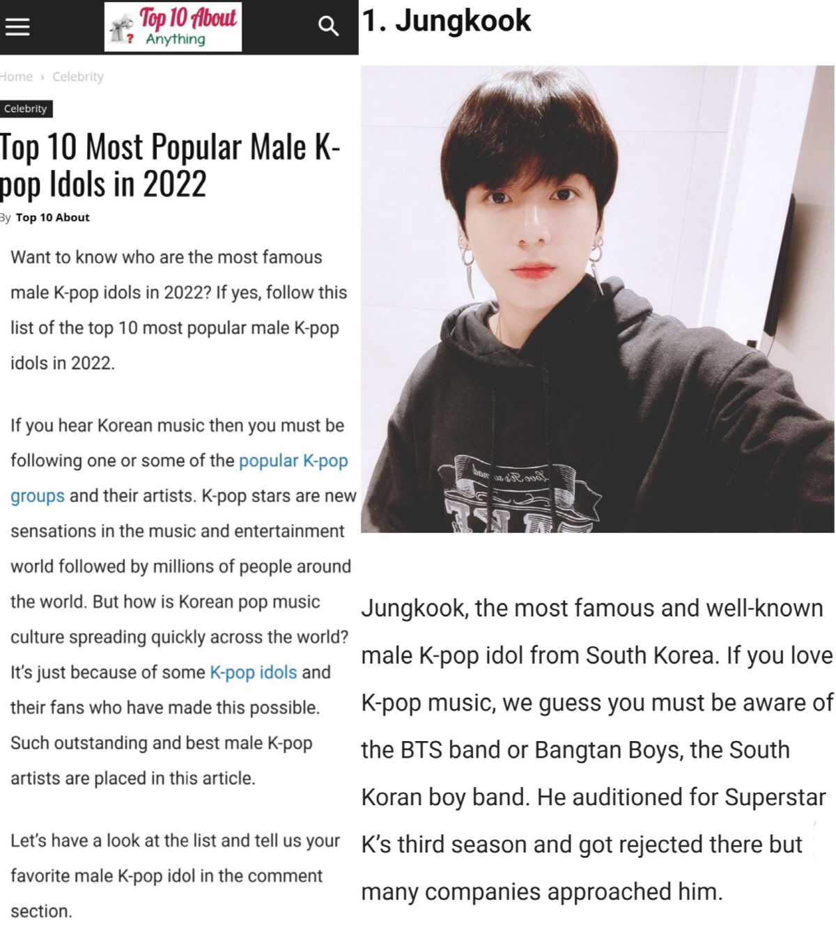 매체는 정국을 "한국에서 가장 유명하고 유명한 남자 K팝 아이돌" 이라 소개했고 BTS의 가장 어린 보컬리스트이자 뛰어난 댄스 실력을 가지고 있으며 열심히 노력하는 자세로 K팝을 대표하는 남자 아이돌이 되었다고 게재했다.