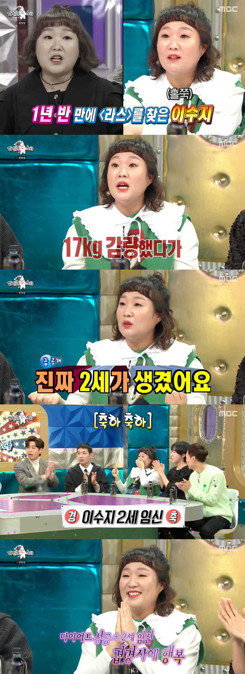 이수지는 "사실 다이어트를 한 목적이 2세 준비였다. 체중을 조금 감량해야 가능할 거 같았는데 살이 빠지다 보니까 건강해져서 진짜 2세가 생겼다"며 결혼 5년 만에 찾아온 임신 소식을 전해 축하를 받았다.