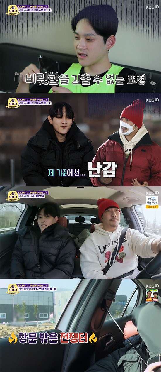 극과 극 텐션을 안고 강화도로 향하던 KCM은 차 안에서 응급 상황에 봉착했다. 급기야 "진돗개 발령"이라는 KCM은 "잘못하면 방송 접을 수 있겠다"라고 말해 궁금증을 높였다. 알고보니 갑자기 화장실이 가고 싶었던 것. 차를 주차한 뒤 갑자기 사라진 KCM은 안절부절 뛰어다녔고, 반면 최환희(지플랫)는 침착하게 그를 기다려 눈길을 끌었다.
