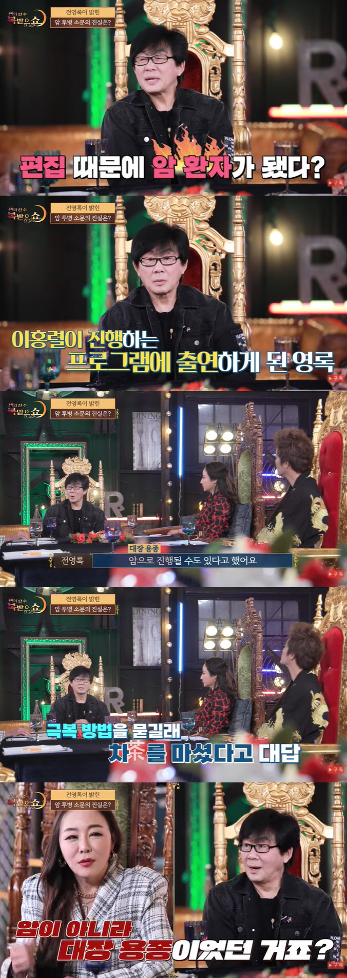전영록은 "그래서 미리 차에 대해 공부하고 얘기를 했는데 이홍렬이 '그래서 뭘로 극복했다는 거냐'더라. 차를 많이 마셨다 했는데 아무도 안 믿어서 편집 당했다"고 이후 암 환자로 오해를 받았다고 밝혔다.