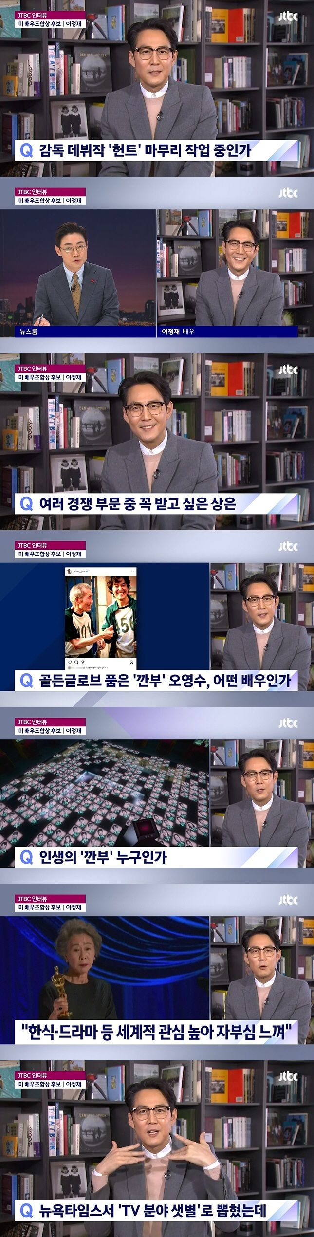 이와 관련해 이정재는 '뉴스룸' 화상 인터뷰에서 "그동안 뉴스로만 접한 시상식이었는데 너무 기쁘고 뜻깊다. '오징어 게임'에 나온 배우들과 나눈 앙상블, 정호연, 액션팀 앙상블 후보까지 올랐다. 거의 전 배우가 후보로 올라 기쁜 일이다"고 전했다.