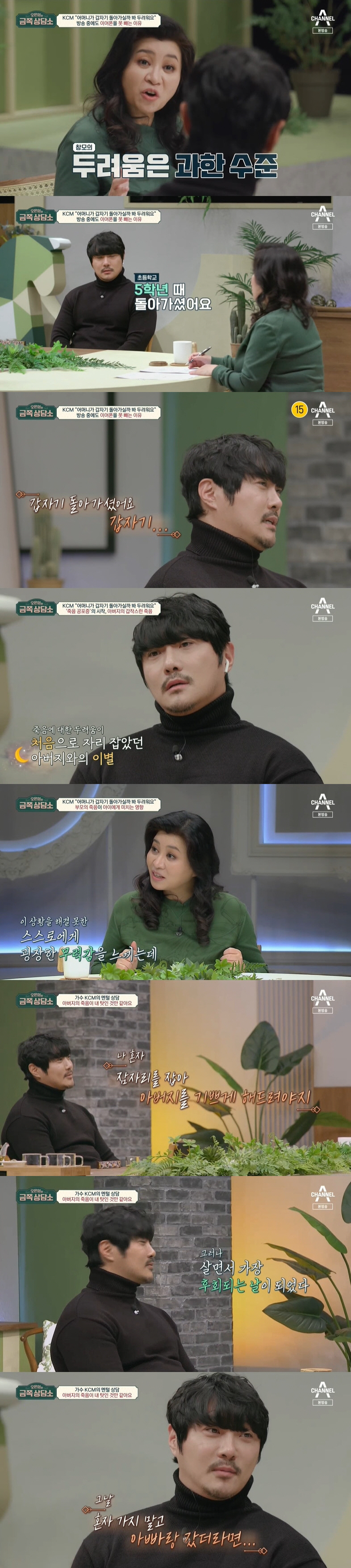 이에 KCM은 아버지와의 마지막 날도 떠올렸다. 그는 "아버지와 잠자리를 잡으러 가기로 했는데, '나 혼자 잠자리를 잡아서 아버지를 기쁘게 해드려야지'라며 혼자 버스를 탔다"면서 "그날 혼자 안가고 아빠랑 갔더라면 술을 안 드셨을텐데 라는 생각이 가장 많이 든다. 살면서 가장 후회되는 날이다"고 했다.