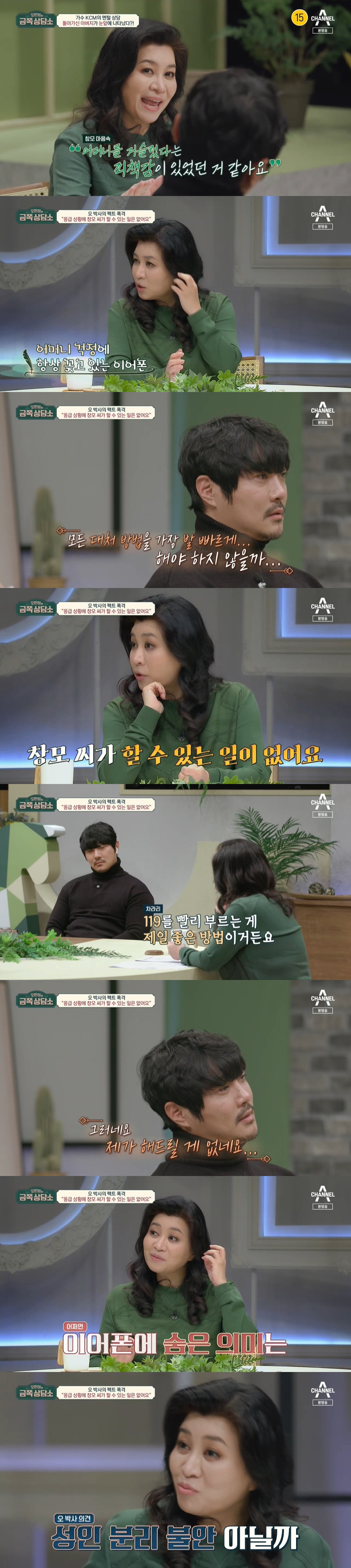 그러자 오은영 박사는 "어머니가 위급하시다고 하면 창모 씨가 할 수 있는 일이 없다. 119를 빨리 부르는 게 가장 좋은 방법이다"며 "냉정하게 들리실지 모르겠지만, 어머니 휴대전화에 119를 1번에 저장하고 위기상황 때 1번을 누를 수 있도록 연습하는 게 좋다. 무력하라고 말씀 드리는 게 아니라 합리적인 대안이다"고 했다.