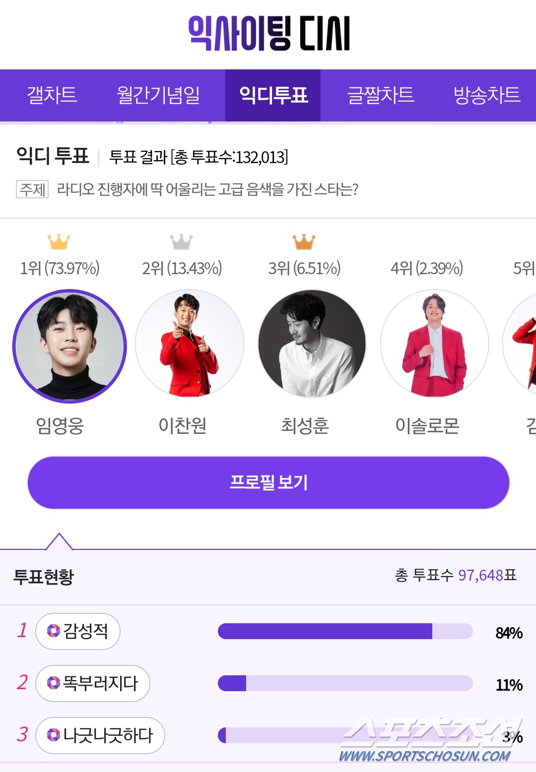 이어 임영웅은 '라디오 진행자에 딱 어울리는 고급 음색을 가진 스타는?' 1위도 차지했다.