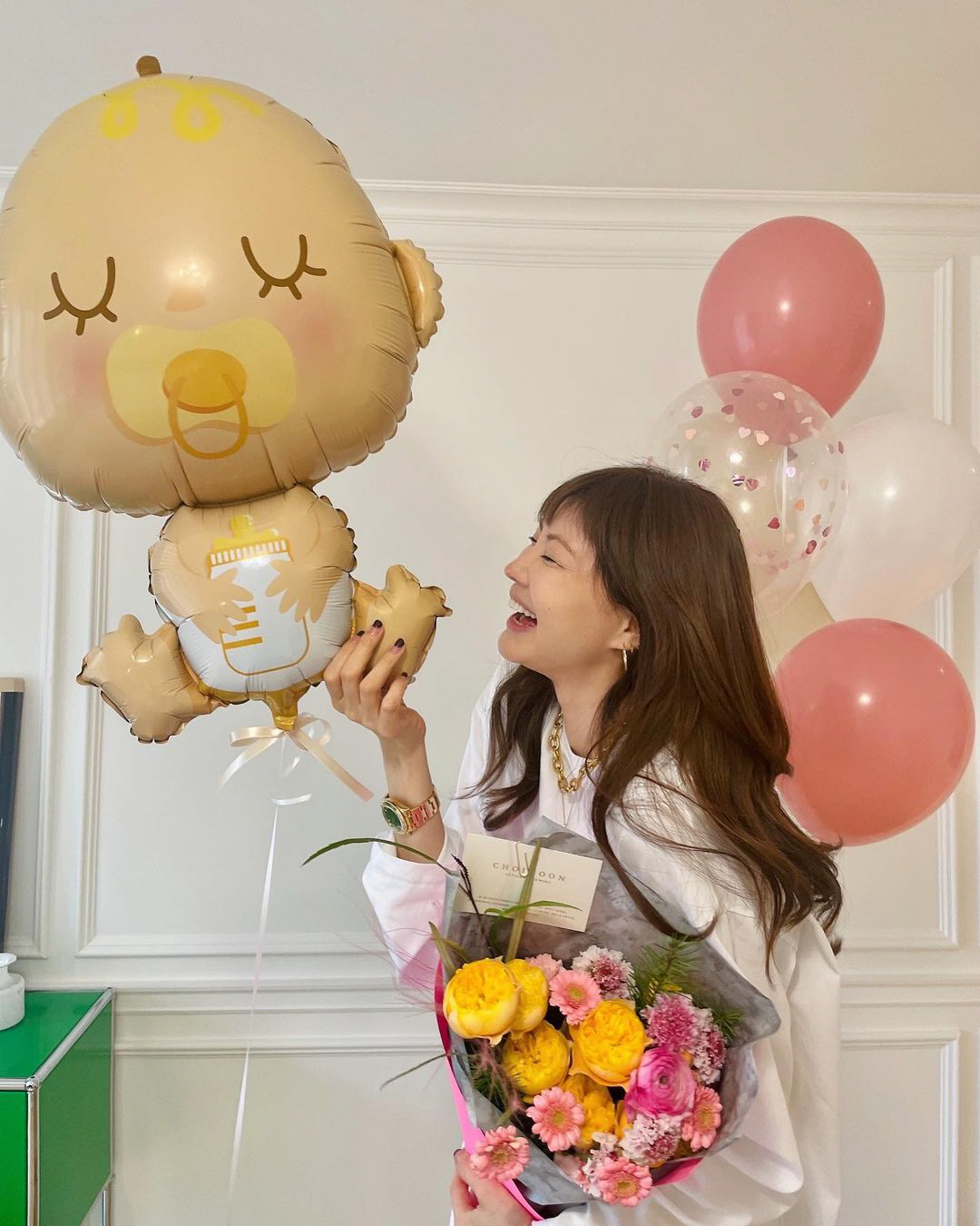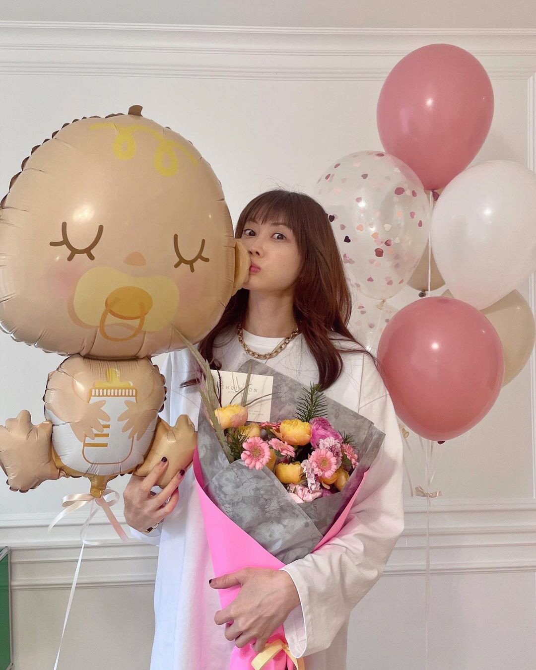 공개된 사진 속 양미라는 축하 꽃다발을 들고 환하게 웃고 있으며, 옆에는 아기 모양의 풍선까지 양미라의 임신을 축하하고 있었다.
