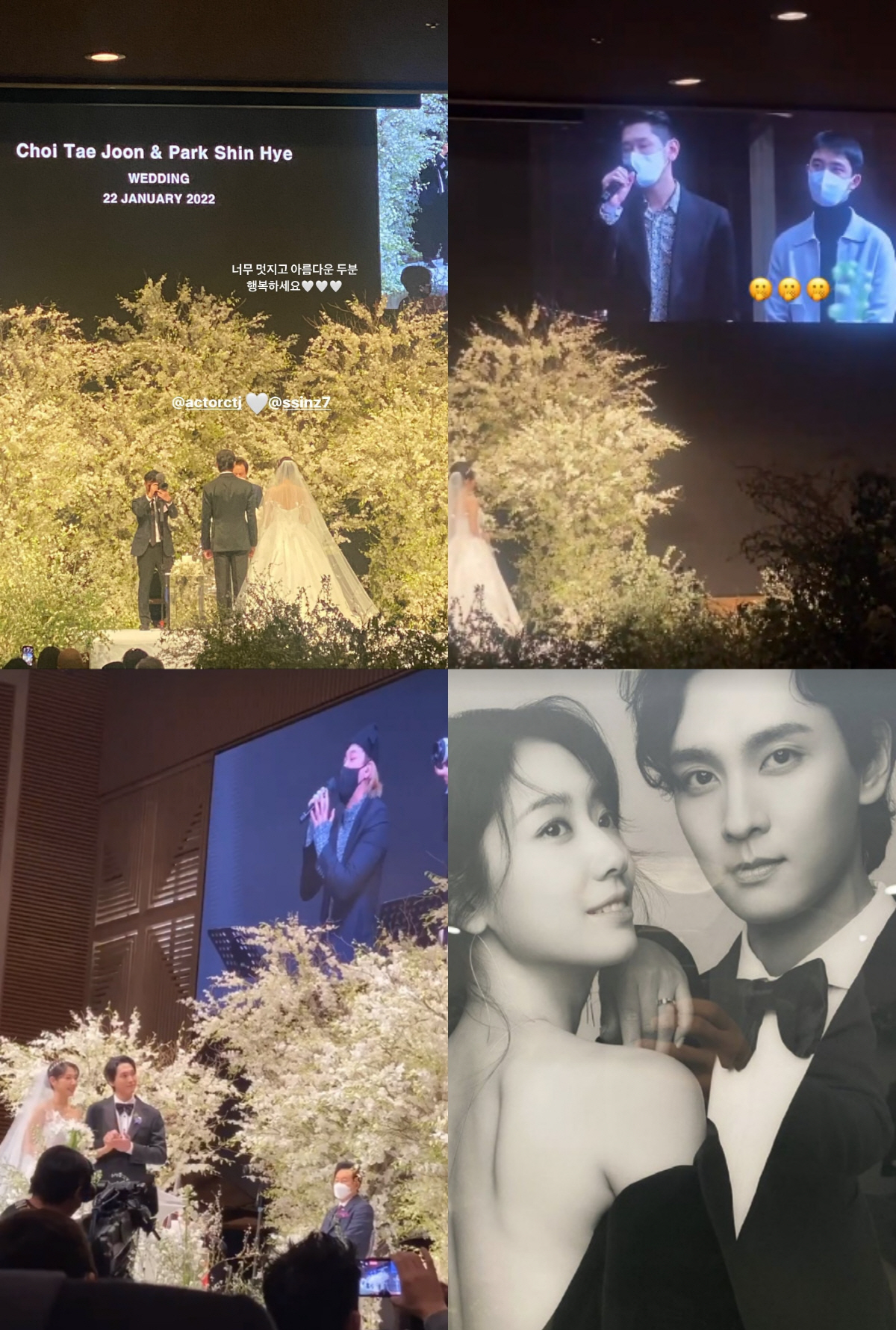 결혼식 축가는 두 사람의 절친들이 나섰다. FT아일랜드 이홍기는 드라마 '상속자들'의 OST '말이야'를 열창했다. 크러쉬와 엑소 디오는 드라마 '도깨비' OST 'Beautiful'을, 이적은 직접 피아노 연주를 하며 '다행이다'를 불렀다. 또 최태준의 절친 지코는 두 사람을 위한 편지를 낭독한 것으로 전해졌다.