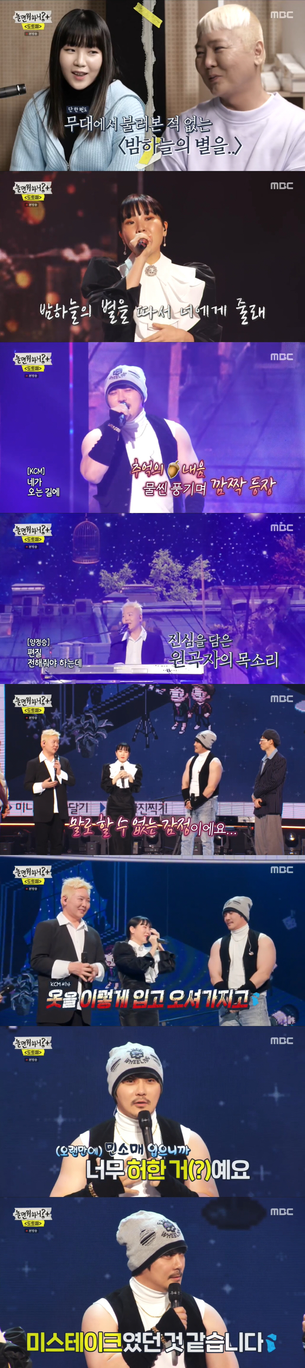 첫 번째 무대는 도토리 시절의 감성을 깨워줄 양정승과 노누의 '밤하늘의 별을' 무대였다. 노누의 애절한 보이스로 시작, 그때 KCM이 깜짝 등장했다. 12년 만에 드디어 처음 모인 세 사람. 양정승의 진심을 담은 목소리까지 감성 가득한 무대가 완성됐다.