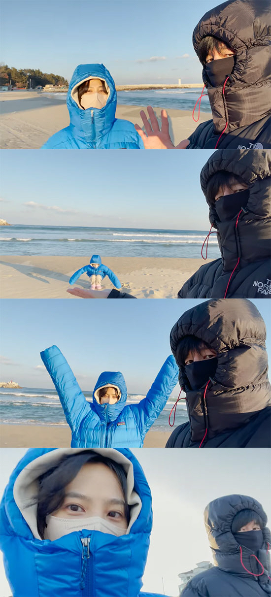 공개한 영상에는 윤승아-김무열 부부가 반려견들과 함께 바닷가에서 데이트를 즐기고 있다. 찬바람이 부는 겨울 바다에 파랑, 검정색 두꺼운 패딩을 입은 부부는 모래 위를 뛰어다니며 즐거운 시간을 보냈다.